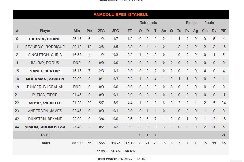 ΕΦΕΣ (Αταμάν): Λάρκιν 6, Μπομπουά 18, Σίνγκλετον 4, Σανλί 7, Μορμάν, Πλάις, Μίσιτς 29, Άντερσον, Ντάνστον 9, Σιμόν 3