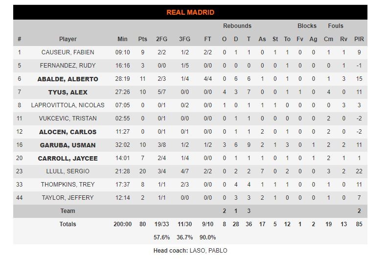 ΡΕΑΛ ΜΑΔΡΙΤΗΣ (Λάσο): Κοσέρ 9, Φερνάντεζ 3, Αμπάλντε 11, Τάιους 10, Λαπροβίτολα, Βούκτσεβιτς, Αλοσέν, Γκαρούμπα 10, Κάρολ 7, Γιουλ 20, Τόμπκινς 8, Τέιλορ 2