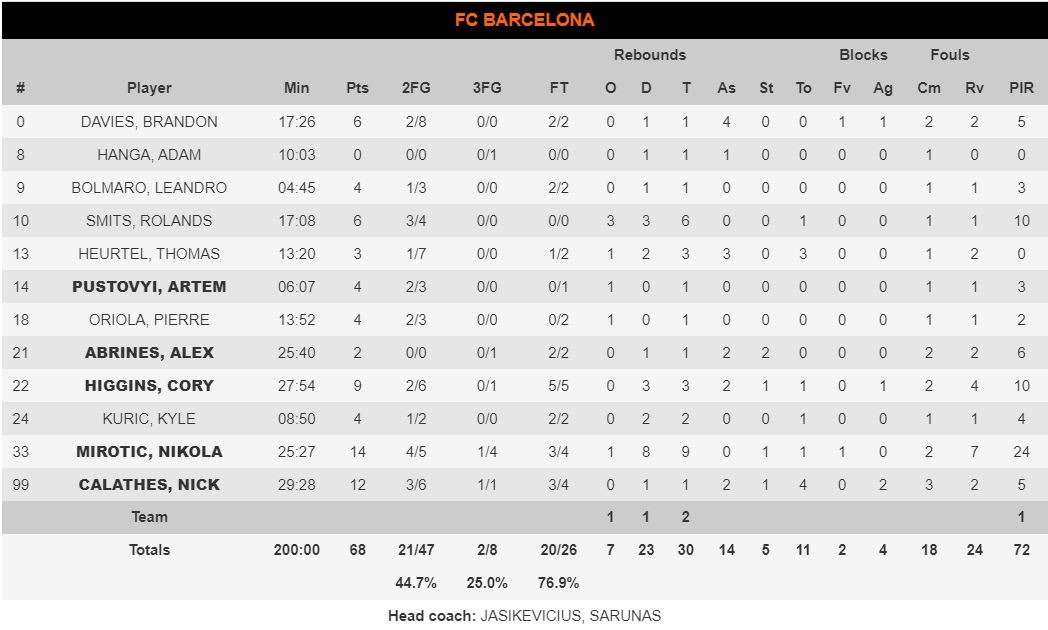 ΜΠΑΡΤΣΕΛΟΝΑ (Γιασικεβίτσιους): Ντέιβις 6, Χάνγκα, Μπολμάρο 4, Σμιτς 6, Ερτέλ 3, Πούστοβι 4, Οριόλα 4, Αμπρίνες 2, Χίγκινς 9, Κούριτς 4, Μίροτιτς 14 , Καλάθης 12