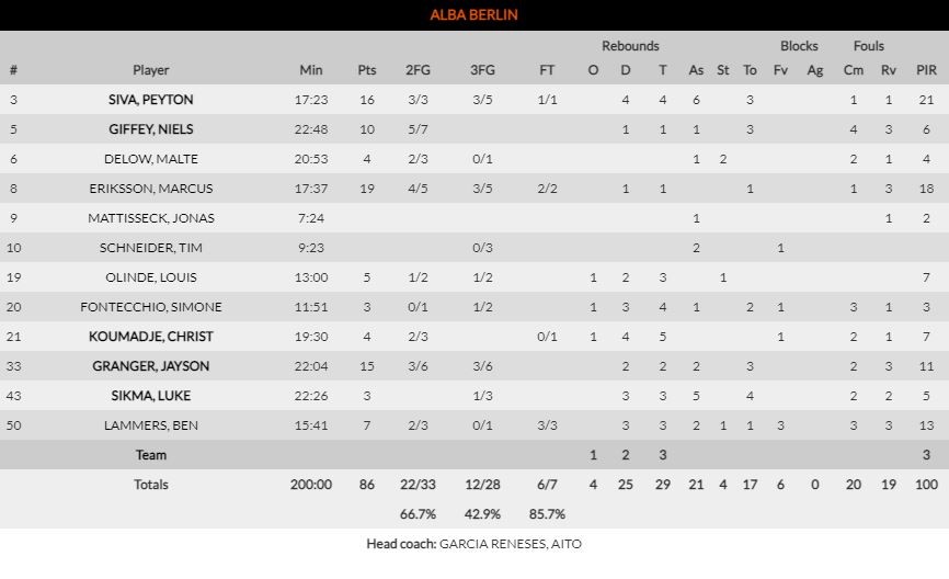 ΑΛΜΠΑ (Ρενέσες): Σίβα 16, Γκιφάι 10, Ντέλοου 4, Έρικσον 19, Μάτισεκ, Σνάιντερ, Ολίντε 5, Φοντέκιο 3, Κουμάτζε 4, Γκρέιντζερ 15, Σίκμα 3, Λάμερς 7