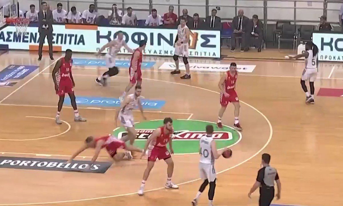 Ο άσος του Ολυμπιακού έπεσε μόνος του στο παρκέ στο 09:20, έπειτα από απλή επαφή του Γιώργο Παπαγιάννη.
