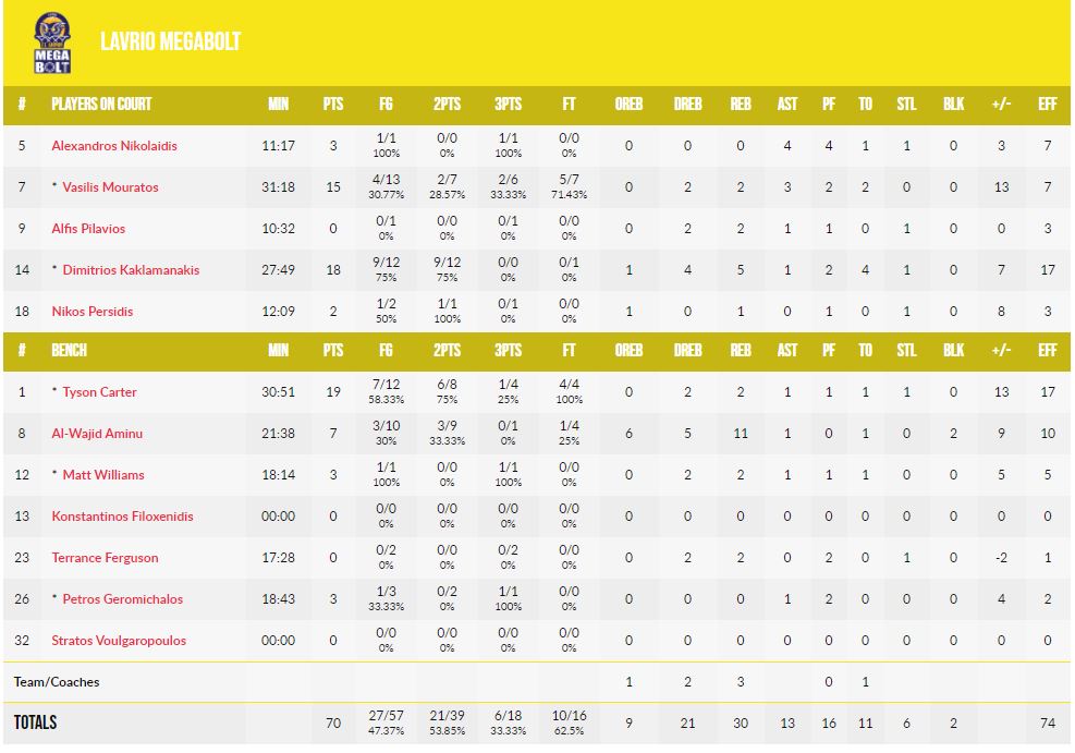 ΛΑΥΡΙΟ (Σερέλης): Νικολαϊδης 3, Μουράτος 15, Πιλάβιος, Κακλαμανάκης 18, Περσίδης 2, Κάρτερ 19, Αμίνου 7, Γουίλιαμς 3, Φέργκιουσον, Γερομιχαλός 3