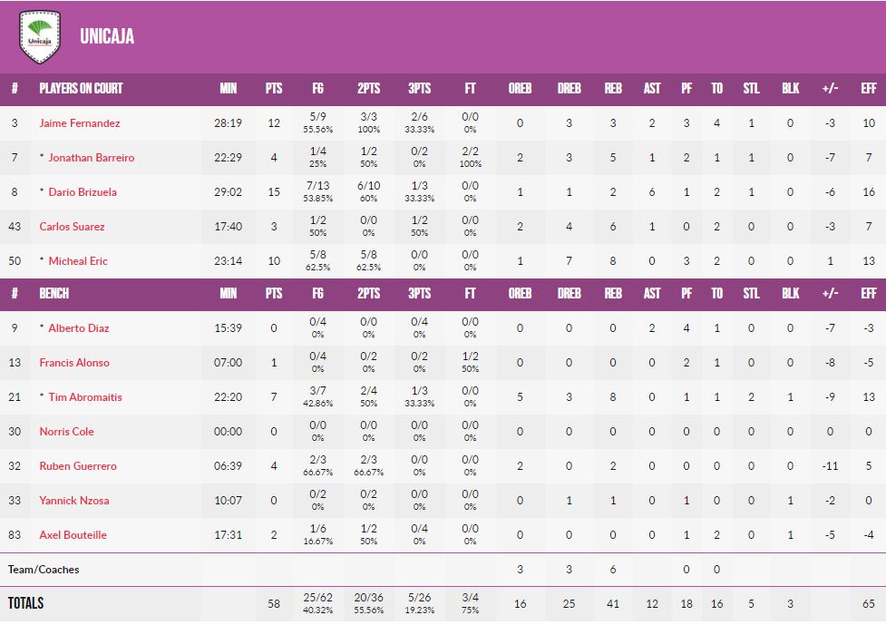 ΜΑΛΑΓΑ (Κατσικάρης): Φερνάντεθ 12, Μπαρέιρο 4, Μπριθουέλα 15, Σουάρεθ 3, Έρικ 10, Ντίαθ, Αλόνσο 1, Αμπρομάιτις 7, Γκερέρο 3, Ενζόσα, Μπουτέιγ 2