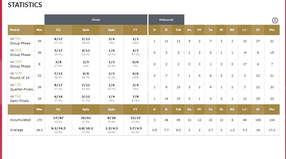 Σε 6 αγώνες στην διοργάνωση έχει 17,3 πόντους- 8,2 ριμπάουντ- 2 ασίστ- 2 κλεψίματα και 1,3 τάπες κατά μέσο όρο. Σουτάρει με 47,5% στα δίποντα, 30,8% στα τρίποντα και 81,5% στις βολές.