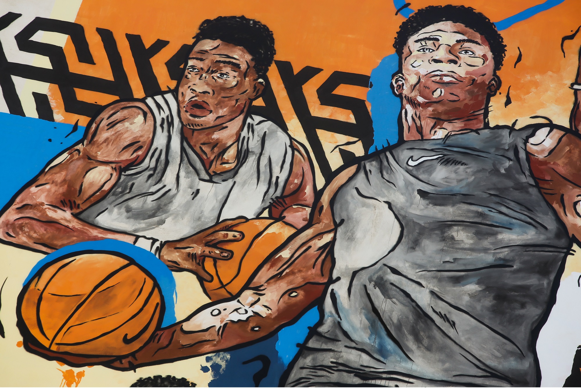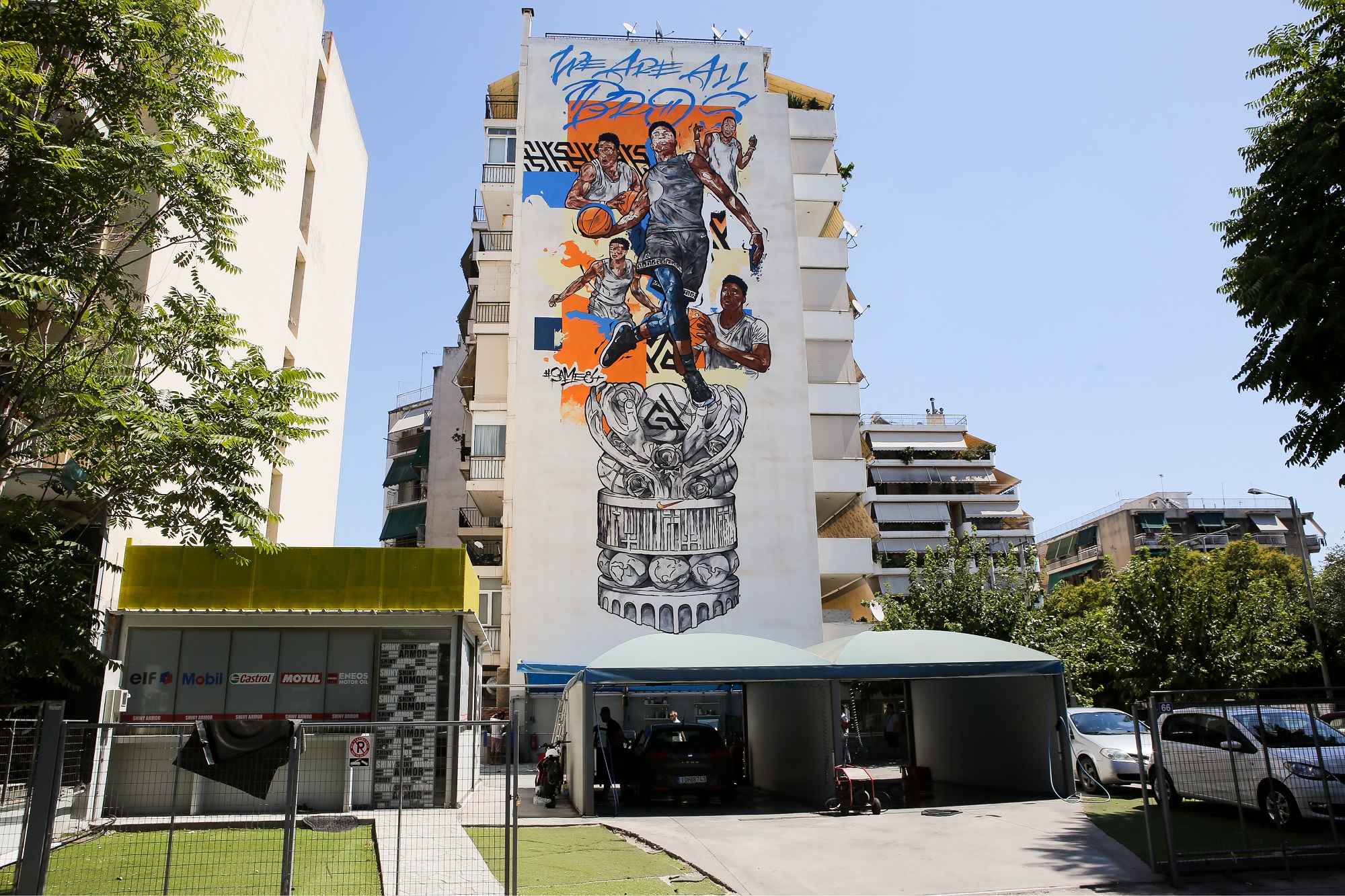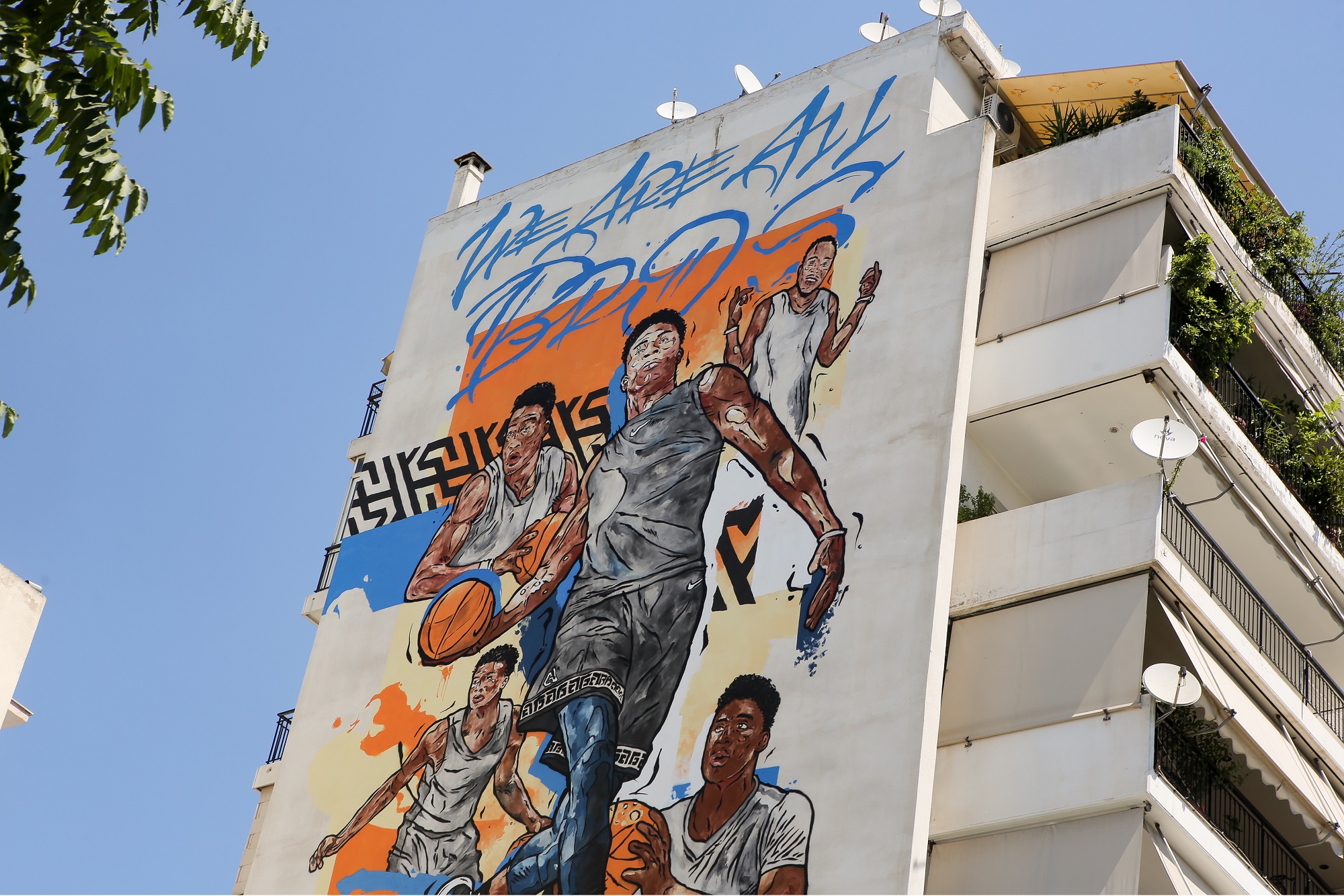 Το «we are all bros» που σημαίνει «είμαστε όλοι αδέρφια», εμπνευσμένο από τη λέξη Antetokounmbros, είναι το σύνθημα του νέου γκράφιτι.