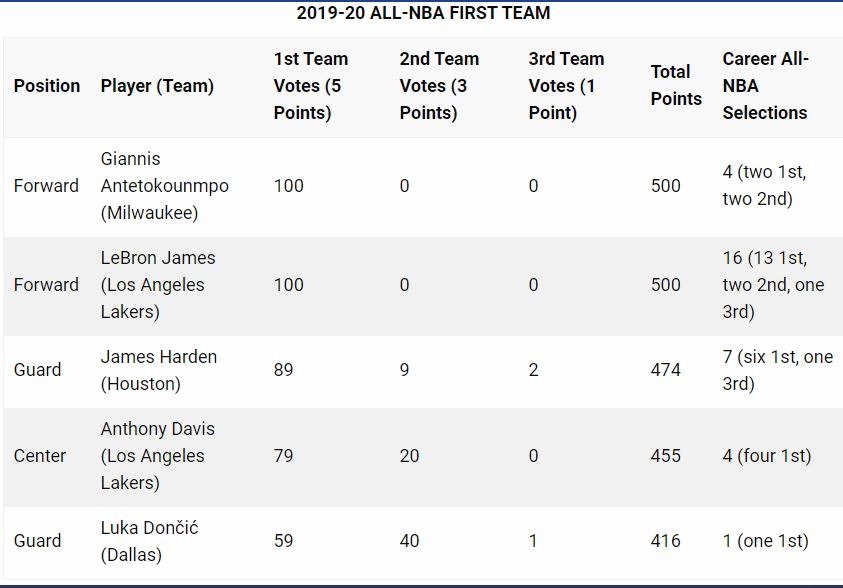 Στην καλύτερη πεντάδα βρέθηκαν ακόμα ο Τζέιμς Χάρντεν, ο Άντονι Ντέιβις και ο Λούκα Ντόντσιτς. Μάλιστα ο ΛεΜπρόν Τζέιμς έκανε ρεκόρ καθώς επελέγη σε All Star Team του NBA για 16η φορά στην καριέρα του. Κι έτσι ξεπέρασε τον Καρίμ Αμπντούλ Τζαμπάρ, τον Κόμπι Μπράιαντ και τον Τιμ Ντάνκαν. Και οι τρεις είχαν 15 επιλογές στην καριέρα τους.