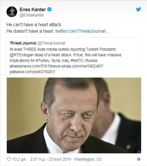 Στις 23 Ιουλίου του 2019, όταν είχαν κυκλοφορήσει φήμες περί θανάτου του Ερντογάν συνεπεία καρδιακής προσβολής, ο Καντέρ… χτύπησε. Και ανέβασε στο Twitter κάτι που συζητήθηκε πολύ ότι δηλαδή αποκλείεται ο Ερντογάν να έπαθε κάτι στην καρδιά του γιατί δεν έχει καρδιά!!!