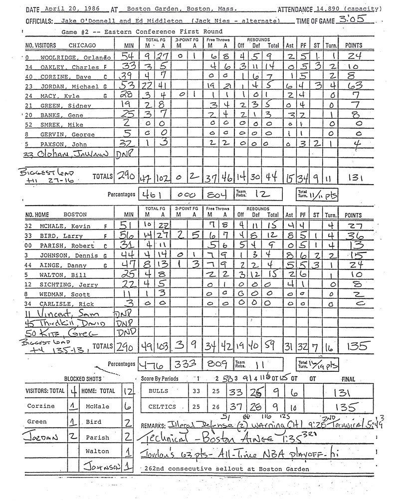 Κανείς από τότε, δεν έχει καταφέρει να τον αποκαθηλώσει. Εκείνο που λησμονούν οι περισσότεροι, είναι πως ο Τζόρνταν και οι Μπουλς ήταν στη μεριά των ηττημένων: 135-131 το τελικό σκορ υπέρ της Βοστόνης, επειτα από διπλή παράταση, σε μία εποχή που ο Τζόρνταν ήταν απλά ένας εκκολαπτόμενος… φόβος και τρόμος στα παρκέ του ΝΒΑ.