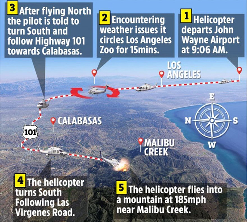 Αυτό που έχει βγει μέχρι τώρα, είναι πως το μοιραίο ελικόπτερο πετούσε υπό δύσκολες καιρικές συνθήκες. Μάλιστα για 15 λεπτά το ελικόπτερο πετούσε για 15 λεπτά πάνω από το Μπούρμπανκ περιμένοντας την άδεια των ελεγκτών εναέριας κυκλοφορίας.