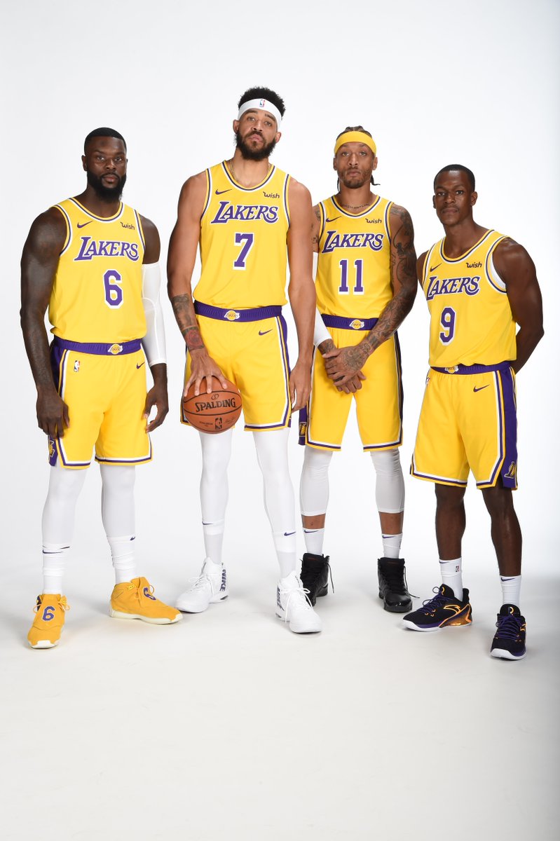 - Οι Ρόντο, Μπίζλεϊ, ΜακΓκί και Στίβενσον ποζάρουν με τη φανέλα των Λέικερς.