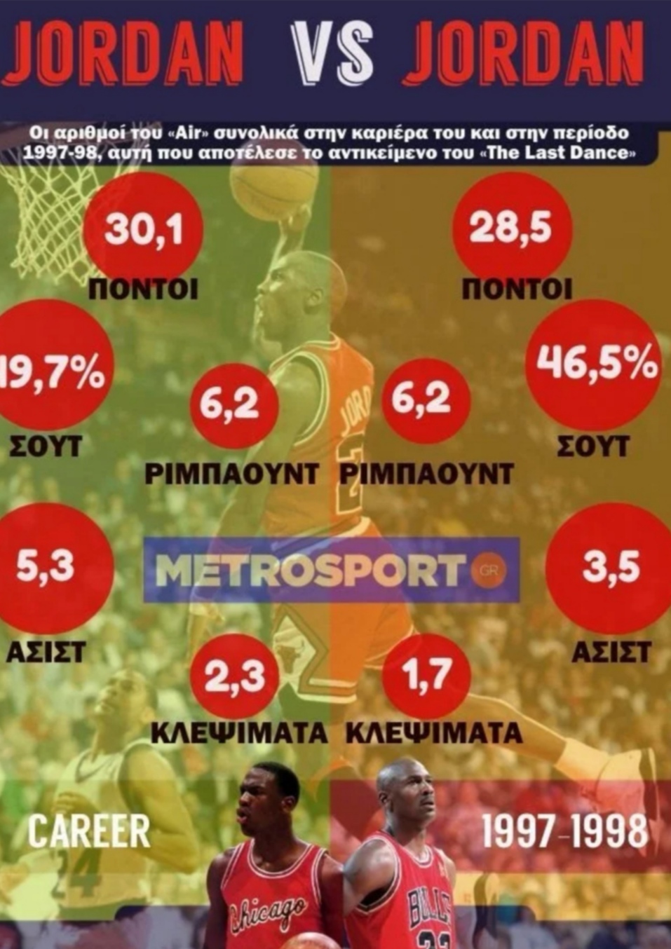 Πέραν από τα ρεκόρ της μιας βραδιάς, εκείνες δηλαδή που απλά έλαμψε ως Τζόρνταν, ήταν πραγματικά μία καλή σεζόν εκείνη η τελευταία του με τους Μπουλς; Κρίνοντας εκ του αποτελέσματος, δεδομένου δηλαδή ότι έφτασε στον τίτλο, η απάντηση είναι προφανής. Βάσει όμως και των αριθμών ήταν μία πολύ καλή σεζόν. Η αντιπαράθεση των αριθμών του με εκείνους που είχε συνολικά στην καριέρα του στο ΝΒΑ, δείχνει ότι ήταν πολύ κοντά στους μέσους όρους του.