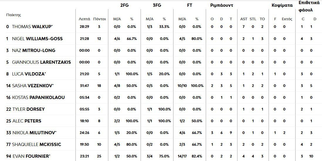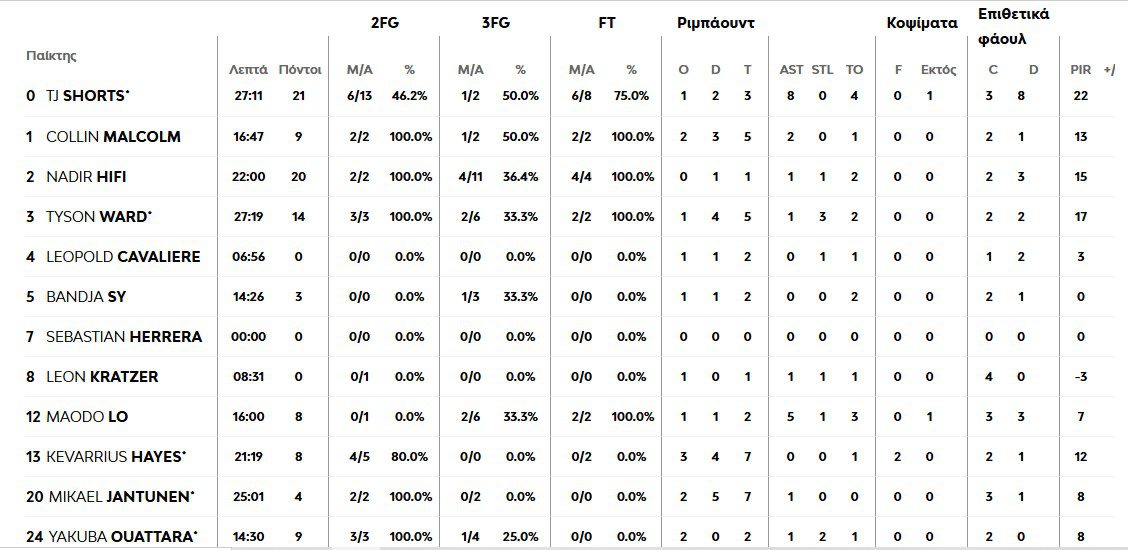 Ο Γιώργος Μπαρτζώκας ξεκίνησε το παιχνίδι με τους Γουόκαπ, Βιλντόζα, Φουρνιέ, Βεζένκοφ και Μιλουτίνοφ ενώ η Παρί με Σορτς, Γουόρντ, Ουατάρα, Γιάντουνεν, Χέις.