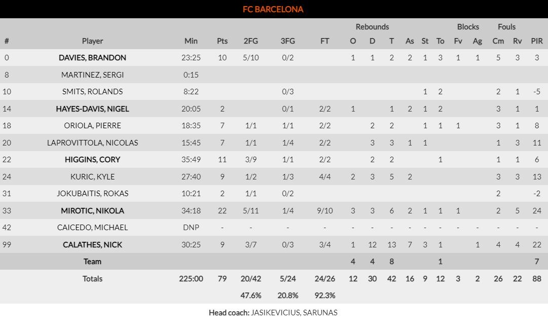 ΜΠΑΡΤΣΕΛΟΝΑ (Γιασικεβίτσιους): Ντέιβις 10, Μαρτίνεθ, Σμιτς, Χέις 2, Οριόλα 7, Λαπροβίτολα 7, Χίγκινς 11, Κούριτς 9, Γιοκουμπάιτις 2, Μίροτιτς 22, Καλάθης 9 (13 ριμπάουντ, 7 ασίστ, 3 κλεψίματα)