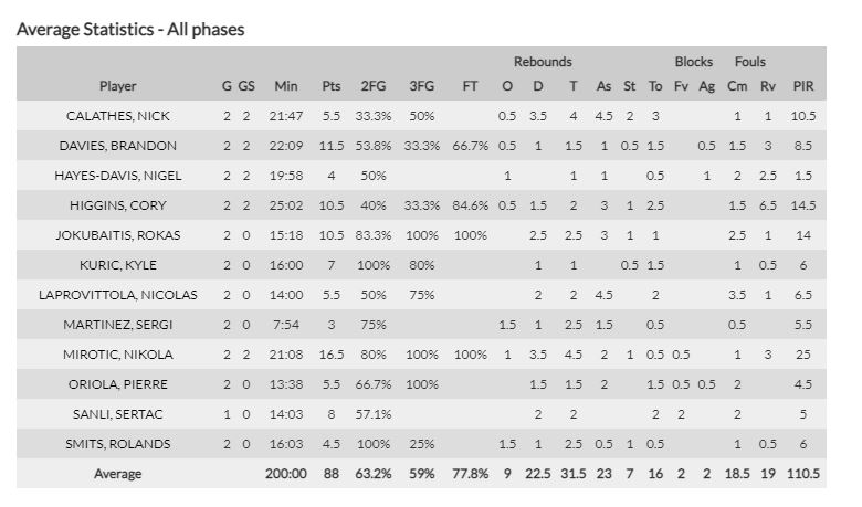 Τέσσερις παίκτες (Μίροτιτς, Ντέιβις, Γιοκουμπάιτις και Χίκγκινς) πετυχαίνουν κατά μέσο όρο τους 49 από τους 88 πόντους της ομάδας.