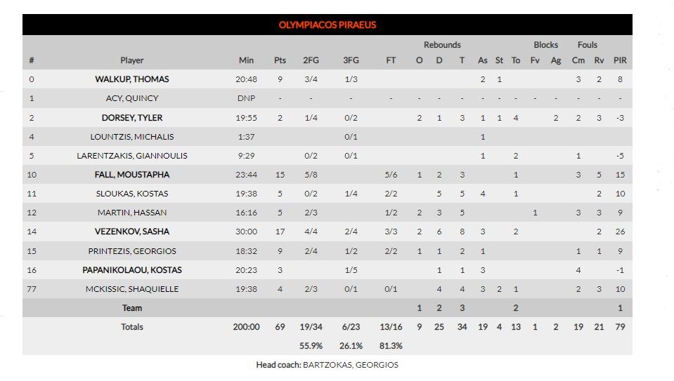 ΟΛΥΜΠΙΑΚΟΣ (Μπαρτζώκας): Γουόκαπ 9, Ντόρσεϊ 2, Λούντζης, Λαρεντζάκης, Φαλ 15, Σλούκας 5, Μάρτιν 5, Βεζένκοφ 17, Πρίντεζης 9, Παπανικολάου 3, ΜακΚίσικ 4
