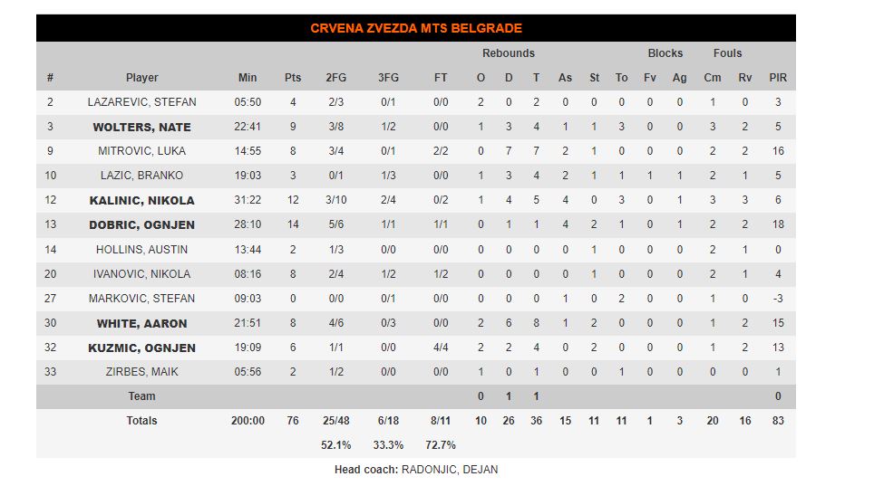 ΕΡΥΘΡΟΣ ΑΣΤΕΡΑΣ (Ράντονιτς): Λαζάρεβιτς 4, Γουόλτερς 9, Μίτροβιτς 8, Λάζιτς 3, Κάλινιτς 12, Ντόμπριτς 14, Χόλινς 2, Ιβάνοβιτς 8, Μάρκοβιτς, Γουάιτ 8, Κούζμιτς 6, Τσίρμπες 2