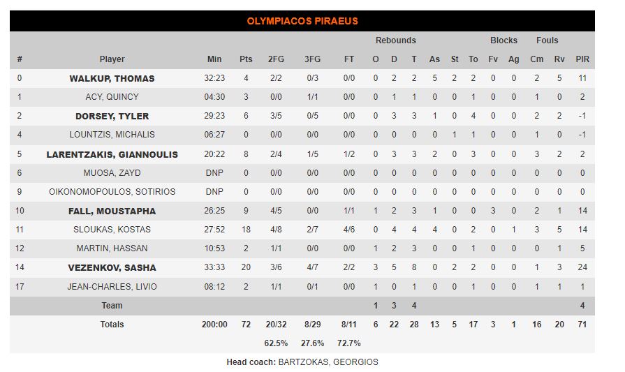 ΟΛΥΜΠΙΑΚΟΣ (Μπαρτζώκας): Γουόκαπ 4, Έισι 3, Ντόρσεϊ 6, Λούντζης, Λαρεντζάκης 8, Φαλ 9, Σλούκας 18, Μάρτιν 2, Βεζένκοφ 20, Ζαν Σαρλ 2