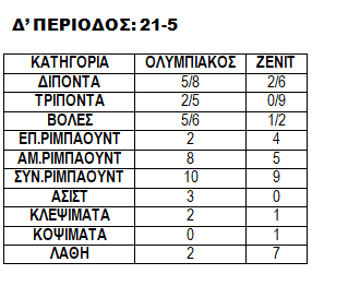 Εδώ πλέον περνάμε σε άλλη διάσταση! Η Ζενίτ μένει στους 5 πόντους με 2/15 σουτ. Έχει 0/9 τρίποντα και είχε ευστοχήσει για τελευταία φορά έξω από τα 6,75μ. με τον Πάνγκος ενώ απέμεναν 52’’ για το τέλος της 3ης περιόδου. Ο Ολυμπιακός κάνει το πρώτο του λάθος μετά από 13’58’’ αγώνα (!) ενώ η Ζενίτ όπως μπορείτε να δείτε μένει χωρίς ασίστ (!) και κάνει 7 λάθη. Το επίσης εντυπωσιακό είναι ότι η Ζενίτ έδωσε την τελευταία της ασίστ 3’37’’ πριν το τέλος της γ’ περιόδου άρα έμεινε 13’37’’ χωρίς τελική πάσα!!! Και στα τελευταία 5’04’’ του αγώνα δεν πέτυχε ούτε πόντο. Η σαρωτική υπεροχή του Ολυμπιακού αποτυπωμένη.