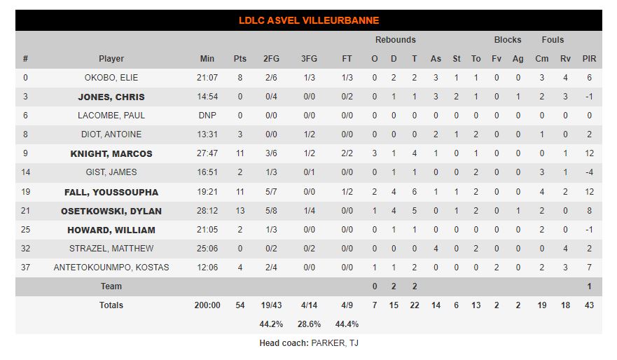 ΟΙ ΑΡΙΘΜΟΙ: Ο Ολυμπιακός είχε 10/18 δίποντα στο πρώτο μέρος και… 13/17 στο δεύτερο! Επίσης 3/15 τρίποντα στο πρώτοι μέρος και 7/10 στο δεύτερο. Τζόουνς και Οκόμπο είχαν συνολικά 8 πόντους με 3/13 σουτ και 1/5 βολές! Ο Ολυμπιακός πήρε 20 πόντους από τα λάθη των Γάλλων.