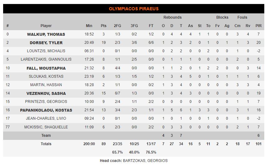 ΟΛΥΜΠΙΑΚΟΣ (Μπαρτζώκας): Γουόκαπ 3, Ντόρσεϊ 19, Λούντζης, Λαρεντζάκης 8, Φαλ 8, Σλούκας 6, Μάρτιν 2, Βεζένκοφ 15, Πρίντεζης 9, Παπανικολάου 13, Ζαν Σαρλ, ΜακΚίσικ 6