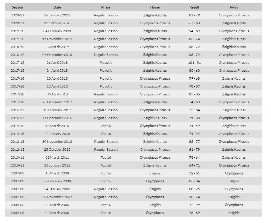 Μετά το 2016 στο Κάουνας και μάλιστα με το ευρύ 75-55 στις πρώτες μέρες του Γιασικεβίτσιους στον πάγκο της Ζαλγκίρις. Ακολούθησαν τρεις σερί νίκες του Ολυμπιακού και το επιμέρους σκορ έφτασε στο 11-3 υπέρ των «ερυθρολεύκων» πριν από τον αγώνα της 28ης Δεκεμβρίου 2018 στο Κάουνας.