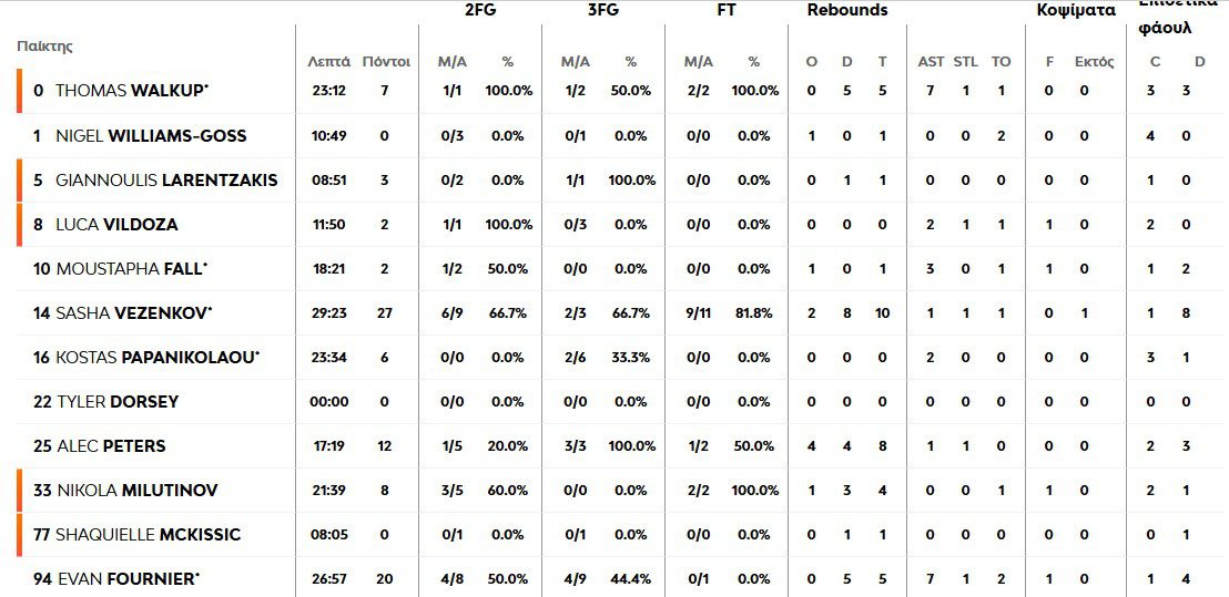 Για τους ερυθρόλευκους κορυφαίος όλων ήταν ο ασταμάτητος Σάσα Βεζένκοφ με 27 πόντους. Από κοντά και ο Εβάν Φουρνιέ με μεγάλα καλάθια, 20 πόντους και 6 ασίστ. Μεγάλες βοήθειες έδωσε ο Άλεκ Πίτερς με 12 πόντους ενώ παίκτης κλειδί σε άμυνα και δημιουργία ήταν ο Τόμας Γουόκαπ (7π., 7ασ).