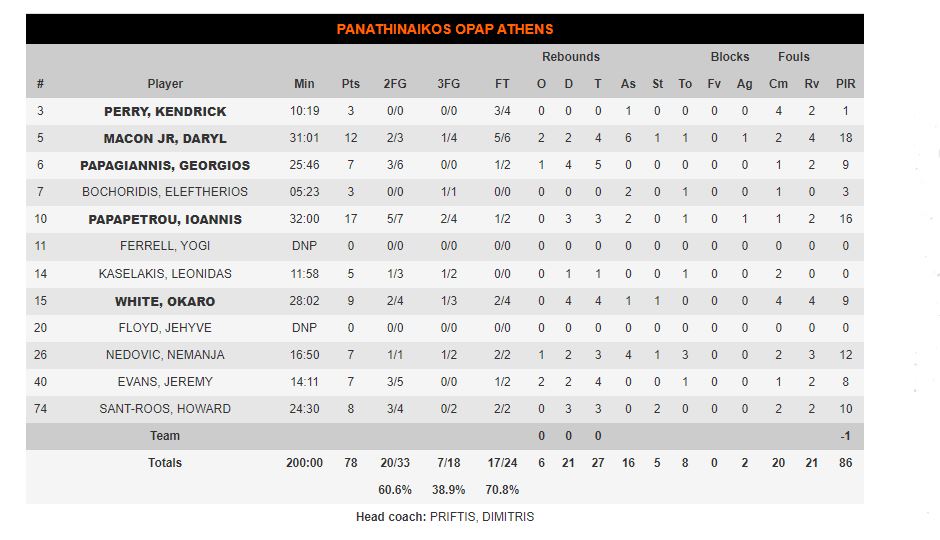 ΠΑΝΑΘΗΝΑΙΚΟΣ (Πρίφτης): Πέρι 3, Μέικον 12, Παπαγιάννης 7, Μποχωρίδης 3, Παπαπέτρου 17, Κασελάκης 5, Γουάιτ 9, Νέντοβιτς 7, Έβανς 7, Σαντ Ρος 8
