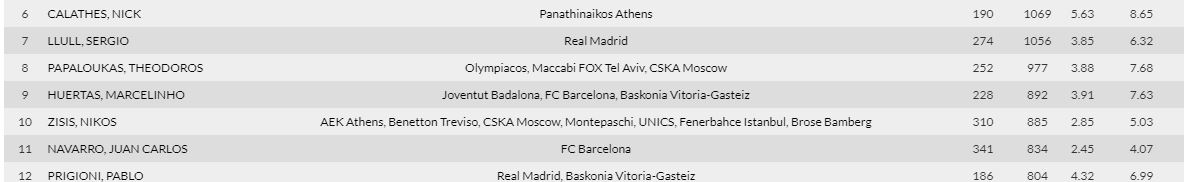 Το πόσο σημαντικό είναι το επίτευγμα του αρχηγού του Παναθηναϊκού φαίνεται από τους παίκτες που έχει αφήσει πίσω του. Κι εδώ περνάμε σε έναν άλλο πίνακα, πολύ πιο ξεκάθαρο σε ό,τι αφορά στην επιχειρηματολογία μας.
