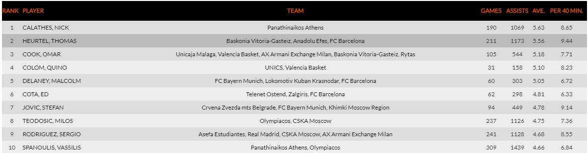 Οπως μπορείτε να διαπιστώσετε ο Νικ έχει 5,63 ασίστ κατά μέσο ότο στην καριέρα του κι ακολουθεί ο Τομά Ερτέλ με 5,63. Την συνέχεια μπορείτε να την διαβάσετε καθώς η δεκάδα κλείνει με έναν Ελληνα ακόμα, τον Βασίλη Σπανούλη.