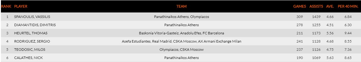 Σε σύνολο ασίστ, ο αρχηγός του Παναθηναϊκού βρίσκεται στην 6η θέση όλων των εποχών. Στον πίνακα που ακολουθεί θα δείτε κι άλλα ενδιαφέροντα πράγματα.
