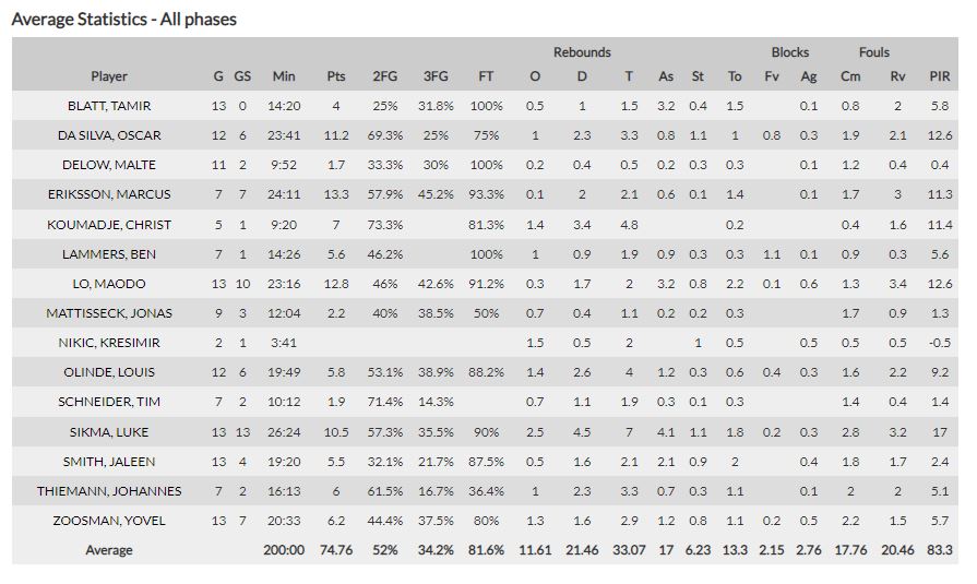 Οι Έρικσον, Ντα Σίλβα, Σίκμα και Λο πετυχαίνουν τους 47,8 από τους 74,8 πόντους της Άλμπα στη φετινή διοργάνωση. Ο Σίκμα, ο Μπλατ (γιός του πρώην κόουτς του Ολυμπιακού), ο Λο και ο Σμιθ έχουν τις 12,6 από τις 17 ασίστ των Γερμανών.