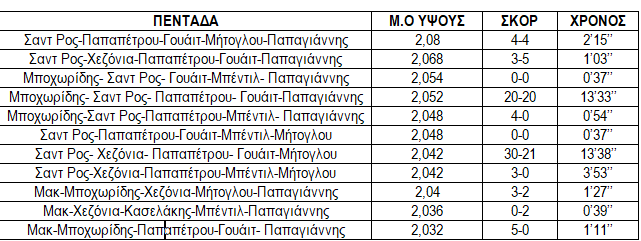 Σαντ Ρος- Χεζόνια-Παπαπέτρου-Γουάιτ-Μήτογλου (η αρχική δηλαδή αλλά κι αυτή που τελείωσε τον αγώνα) που έπαιξε 13’38’’. Και Μποχωρίδης-Σαντ Ρος-Παπαπέτρου-Γουάιτ-Παπαγιάννης που έπαιξε 5 δευτερόλεπτα λιγότερα. Και οι δύο είχαν συνολικό επιμέρους σκορ 50-41.
