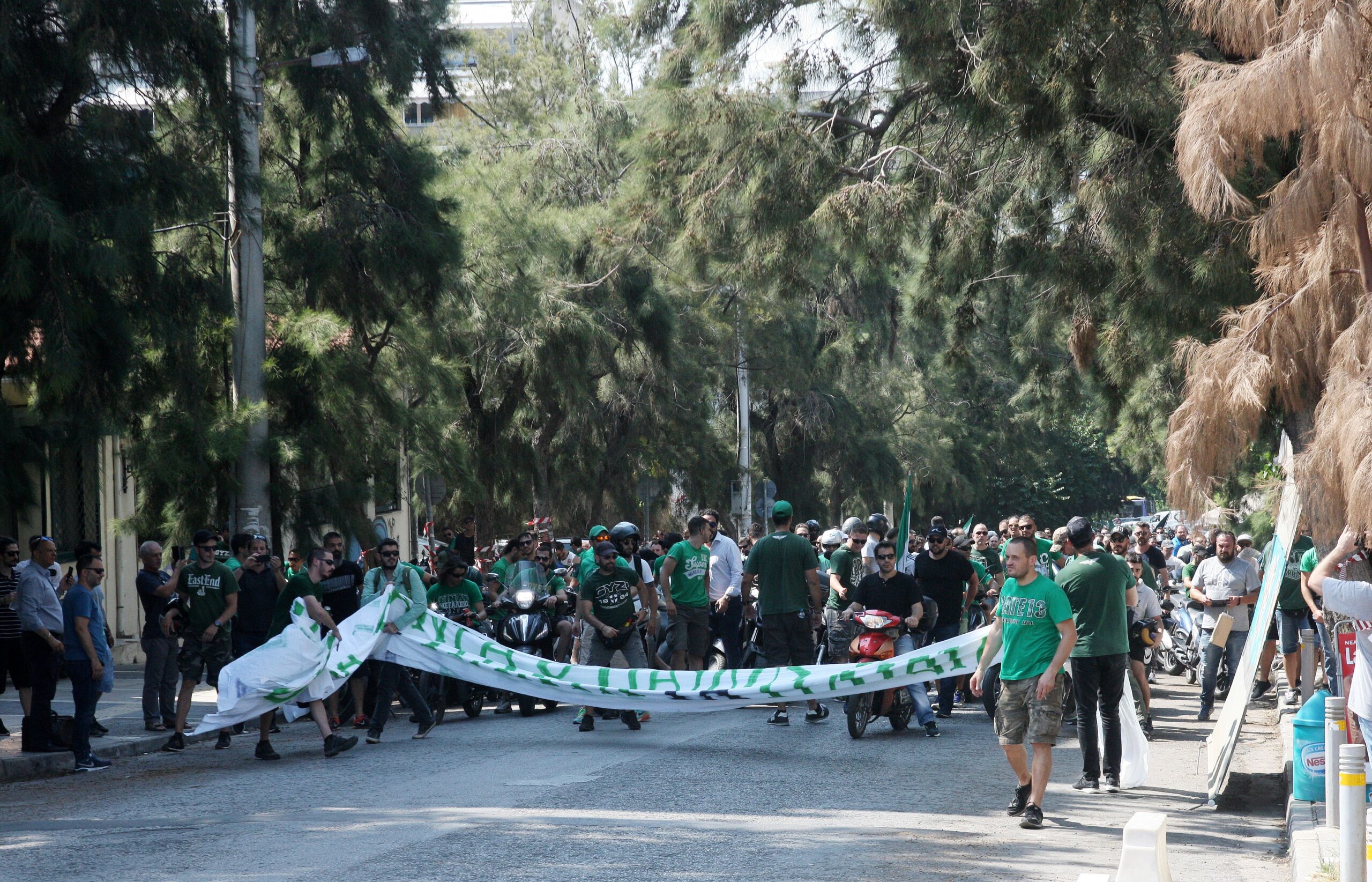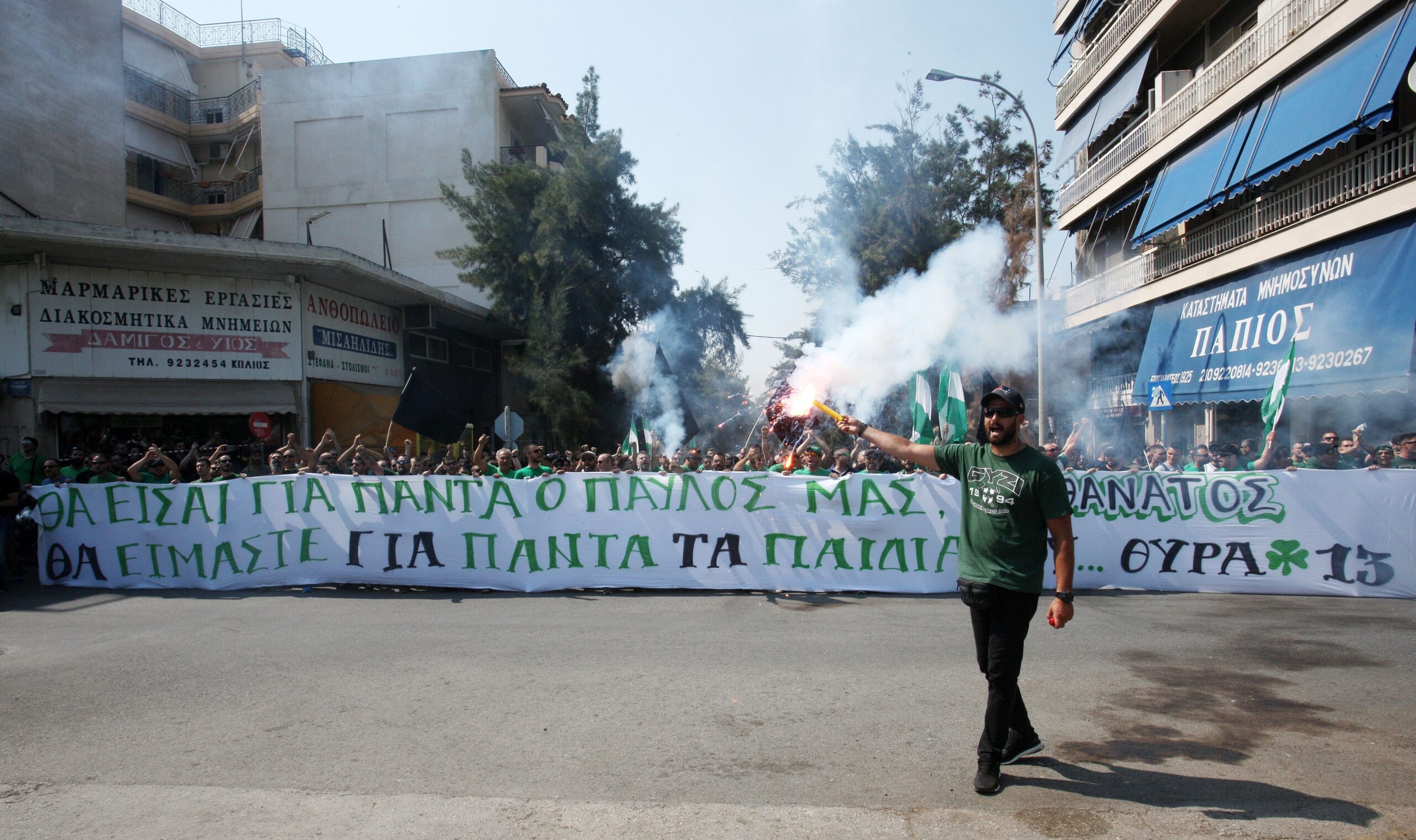 Έξω από το Α’ Νεκροταφείο, οι οπαδοί του Παναθηναϊκού φωνάζουν «Αθάνατος» και «Παύλο θεέ ζεις ανάμεσα μας, πάντοτε θα είσαι μέσα στην καρδιά μας». Να σημειωθεί, πάντως, ότι ο κόσμος έχει παραμείνει διακριτικά μακριά από το κοιμητήριο. Ο Δημήτρης Γιαννακόπουλος μίλησε λίγο μαζί τους και στη συνέχεια κατευθύνθηκε στο κοιμητήριο.
