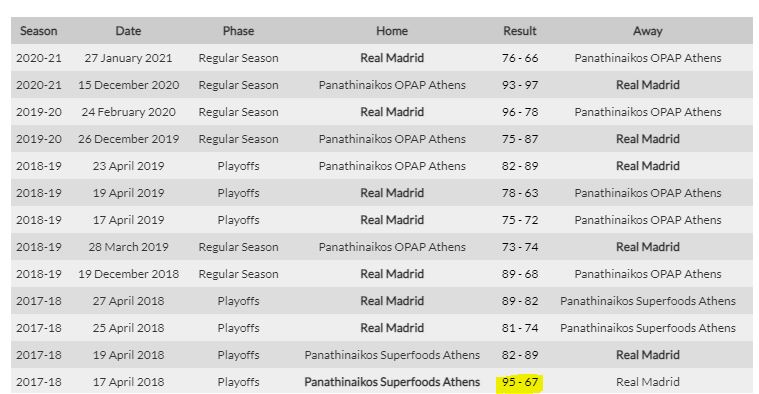 Μέχρι τον Απρίλιο του 2018 το σκορ ήταν… 10-9 υπέρ του Παναθηναϊκού αλλά ακολούθησαν 12 συνεχόμενες νίκες της Ρεάλ. Οι πράσινοι έχουν να νικήσουν τους Μαδριλένους (όπως βλέπετε στον πίνακα) από τις 17 Απριλίου του 2018 (στον πρώτο αγώνα των πλέι οφ, 95-67 στο ΟΑΚΑ)