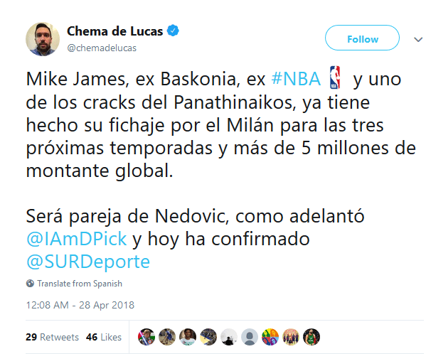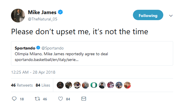 Η είδηση δεν είναι καινούργια. Εχει αναφερθεί εδώ και καιρό πως ο Μάικ Τζέιμς ενδέχεται να συνεχίσει την καριέρα του στην Αρμάνι Μιλάνο.