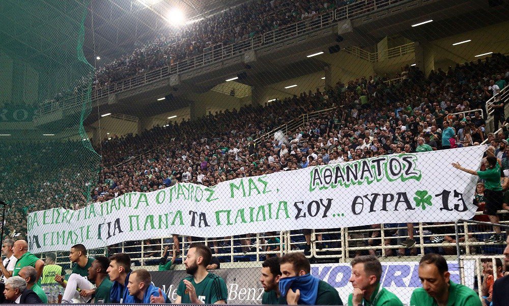 Ο κόσμος του «τριφυλλιού» είχε ετοιμάσει πανό και συνθήματα για τον ιστορικό ιδιοκτήτη, ενώ λίγο πριν από το τέλος της αναμέτρησης με τον Ολυμπιακό οι οπαδοί φώναξαν: «Πρωτάθλημα μέσα το Παλέ, για εσένα Γιαννακόπουλε».