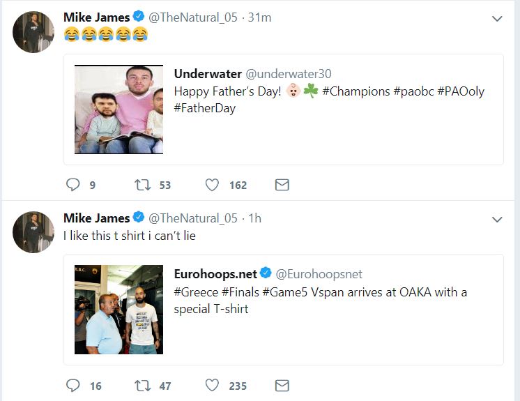 Σε μεγάλα κέφια για «πείραγμα» στα social media ήταν ο Μάικ Τζέιμς, μετά την κατάκτηση του τίτλου από τον Παναθηναϊκο. Στην αρχή τρόλαρε τον Βασίλη Σπανούλη με αφορμή το μπλουζάκι με το οποίο εμφανίστηκε στο ΟΑΚΑ, που έγραφε: «Δώσε μου την μπάλα και κάντε στην άκρη». «Μου αρέσει αυτό το μπλουζάκι, δεν μπορώ να πω...