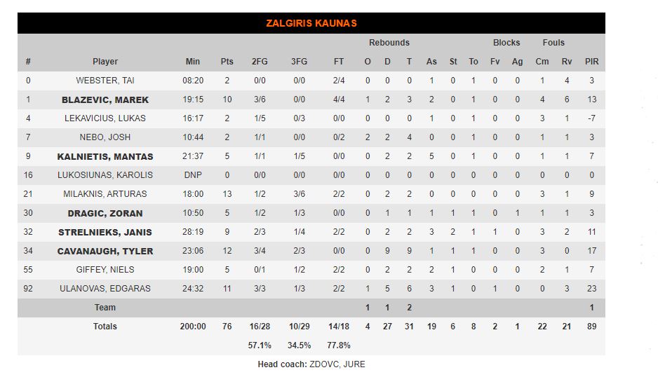 ΖΑΛΓΚΙΡΙΣ ΚΑΟΥΝΑΣ (Ζντοβτς): Γουέμπστερ 2, Μπλάζεβιτς 10, Λεκαβίτσιους 2, Νέμπο 2, Καλνιέτις 5, Μιλάκνις 13, Ντράγκιτς 5, Στρέλνιεκς 9, Κάβανο 12, Γκιφάι 5, Ουλανόβας 11