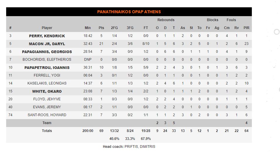 ΠΑΝΑΘΗΝΑΪΚΟΣ (Πρίφτης): Πέρι 5, Μέικον 21, Παπαγιάννης 7, Παπαπέτρου 10, Φερέλ 3, Κασελάκης 6, Γουάιτ 7, Φλόιντ 1, Έβανς 2, Σαντ Ρος 7