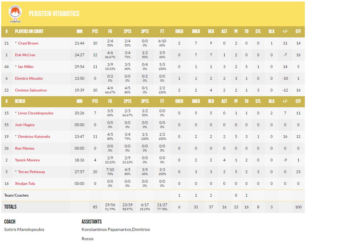 ΠΕΡΙΣΤΕΡΙ (Μανωλόπουλος): ΜακΚρι 12, Μωραϊτης, Μπράουν 10, Σαλούστρος 10, Μίλερ 11, Μορέιρα 4, Πέτεγουεϊ 20, Χρυσικόπουλος 7, Κατσίβελης 11