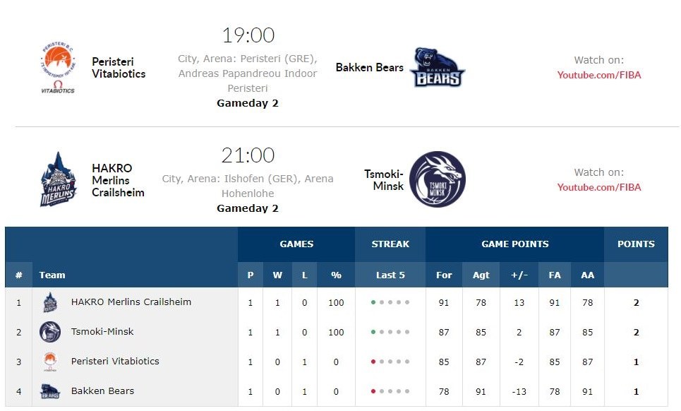 Στην πρεμιέρα της διοργάνωσης ηττήθηκε 78-91 στην έδρα της από την Κράλσχαϊμ. Ο Μάρβελ Χάρις με 16 πόντους και ο Μισέλ Ντιούφ όσους και ο Ντάρκο Τζούκιτς ήταν οι καλύτεροι σκόρερ της.