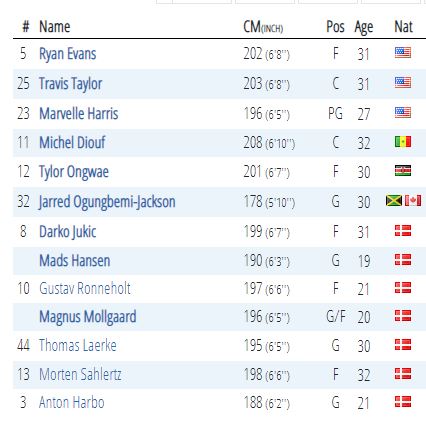 Στο πρωτάθλημα της Δανίας έχει ρεκόρ 2-0. Πρώτος σκόρερ της ομάδας είναι ο Ράιαν Έβανς (16 πόντοι κατά μέσο όρο αλλά και 7,5 ριμπάουντ). Ο Μάρβελ Χάρις έχει καλύτερο μέσο όρο (17) αλλά σε έναν αγώνα.