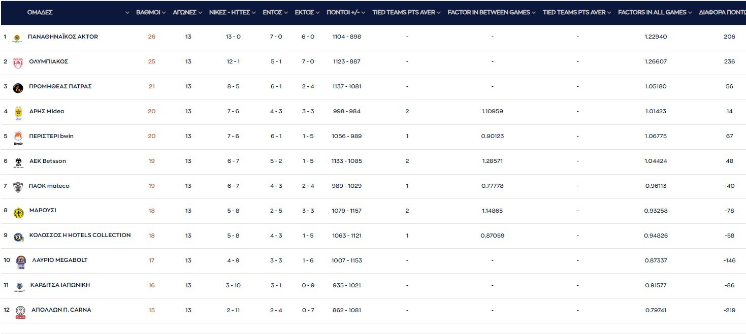 Βαθμολογία Basket League (σε 13 αγωνιστικές)