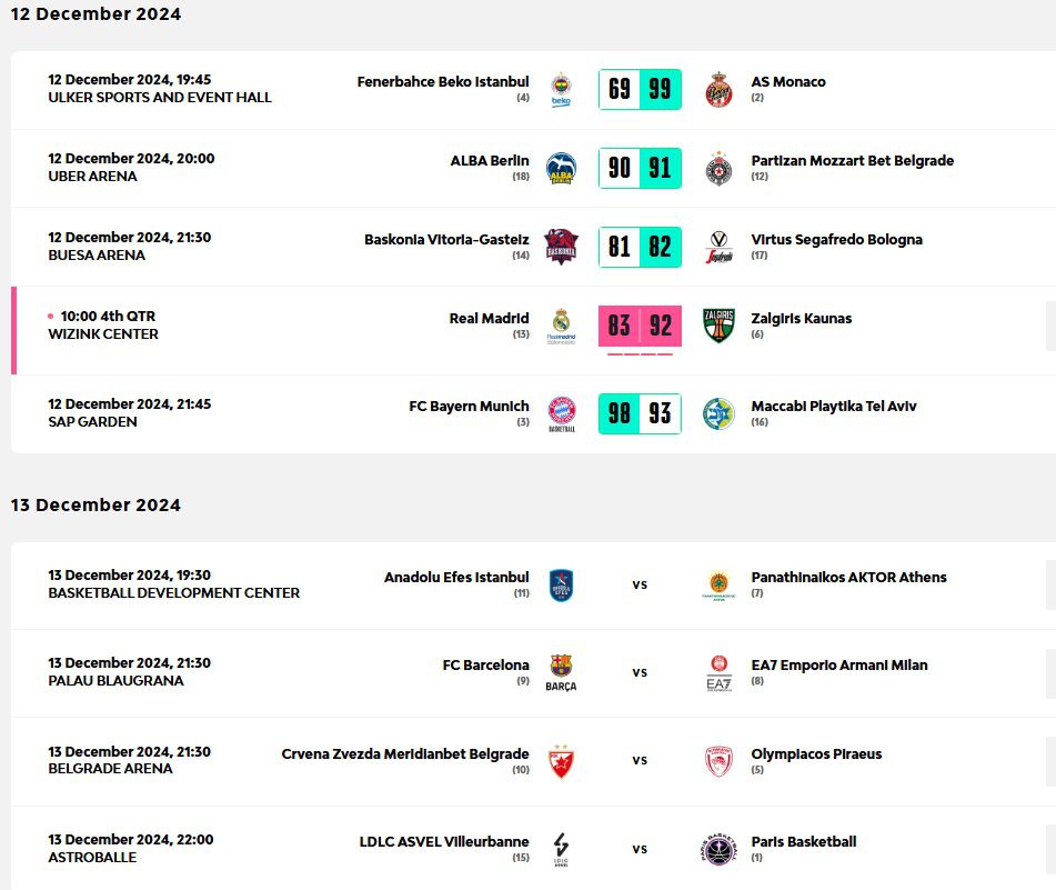 Τέλος να αναφέρουμε οτι την Παρασκευή (13/12) αγωνίζονται και οι δύο ελληνικές ομάδες, με τον Παναθηναϊκό να φιλοξενείται από την Εφές στις 19:30, ενώ δύο ώρες αργότερα ο Ολυμπιακός δοκιμάζεται στο Βελιγράδι από τον Ερυθρό Αστέρα του Γιάννη Σφαιρόπουλου.