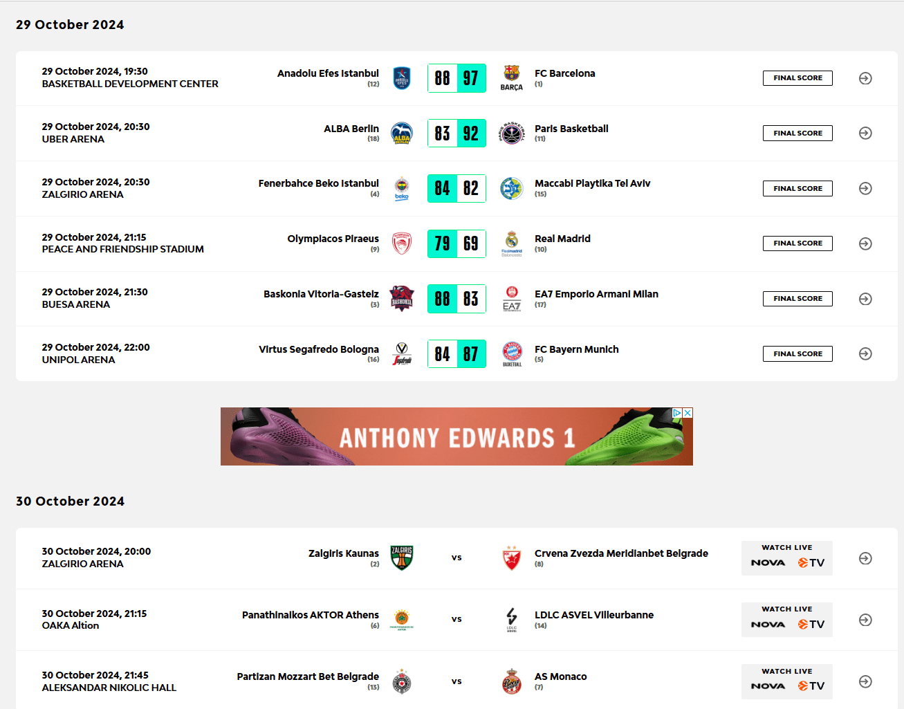 Αποτελέσματα και υπόλοιπο πρόγραμμα της 6ης αγωνιστικής της Ευρωλίγκας