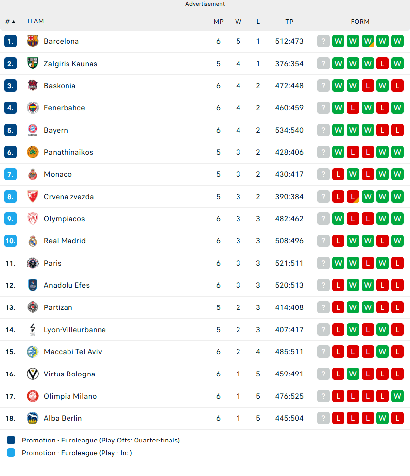 Βαθμολογία Euroleague: Σε έξι αγωνιστικές