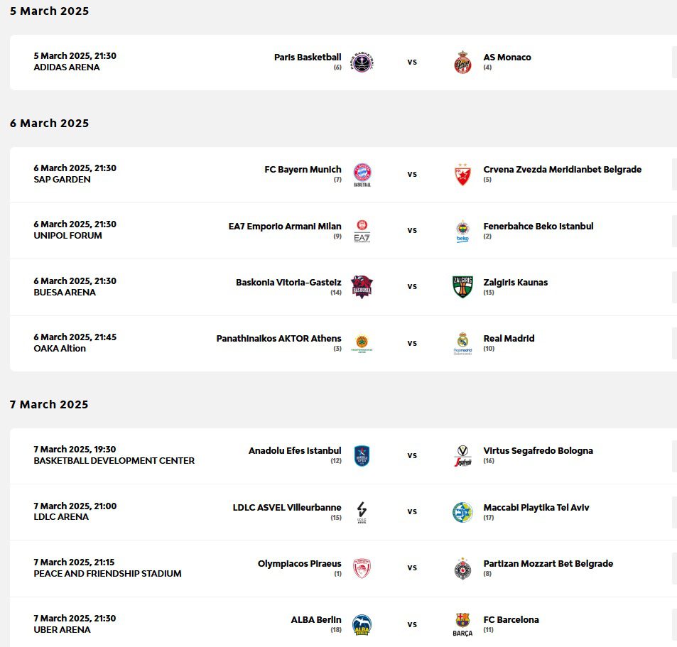 Η δράση στην Ευρωλίγκα συνεχίζεται με την 28η αγωνιστική Η οποία διεξάγεται στις 5, 6 και 7 Μαρτίου, με τον Παναθηναϊκό να υποδέχεται τη Ρεάλ Μαδρίτης (6/3, 21:45) και τον Ολυμπιακό την Παρτιζάν (7/3, 21:15).