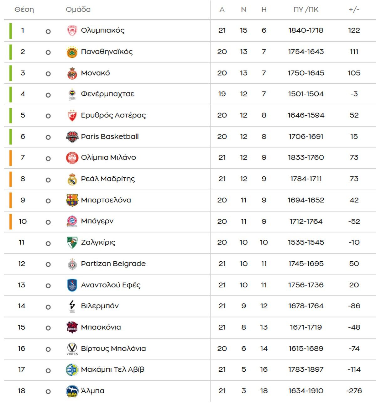 Η Βαθμολογία Euroleague παραμένει με χρώμα ερυθρόλευκο και ο Ολυμπιακός θα είναι σίγουρα πρώτος μετά την 21η αγωνιστική