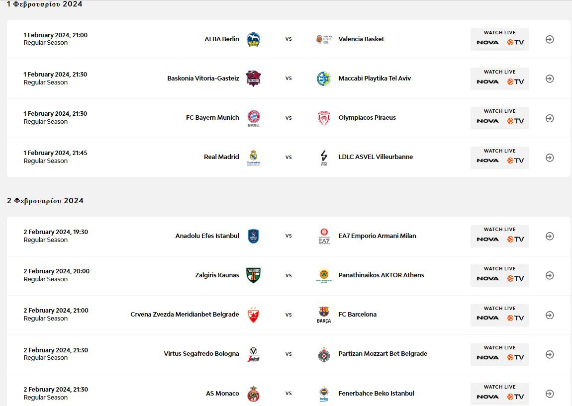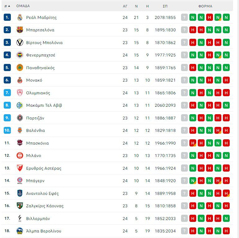 Βαθμολογία Euroleague σε 24 αγωνιστικές