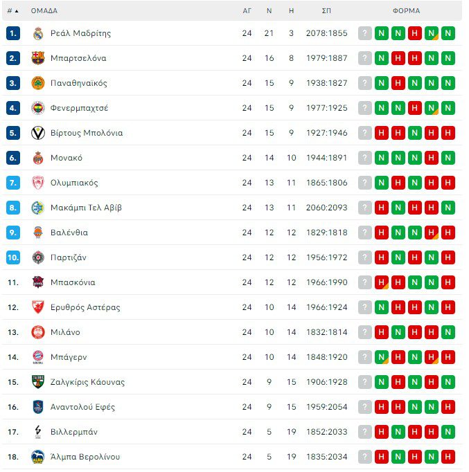 Βαθμολογία Euroleague: Πώς διαμορφώθηκε η κατάταξη μετά τη νίκη του Παναθηναϊκού